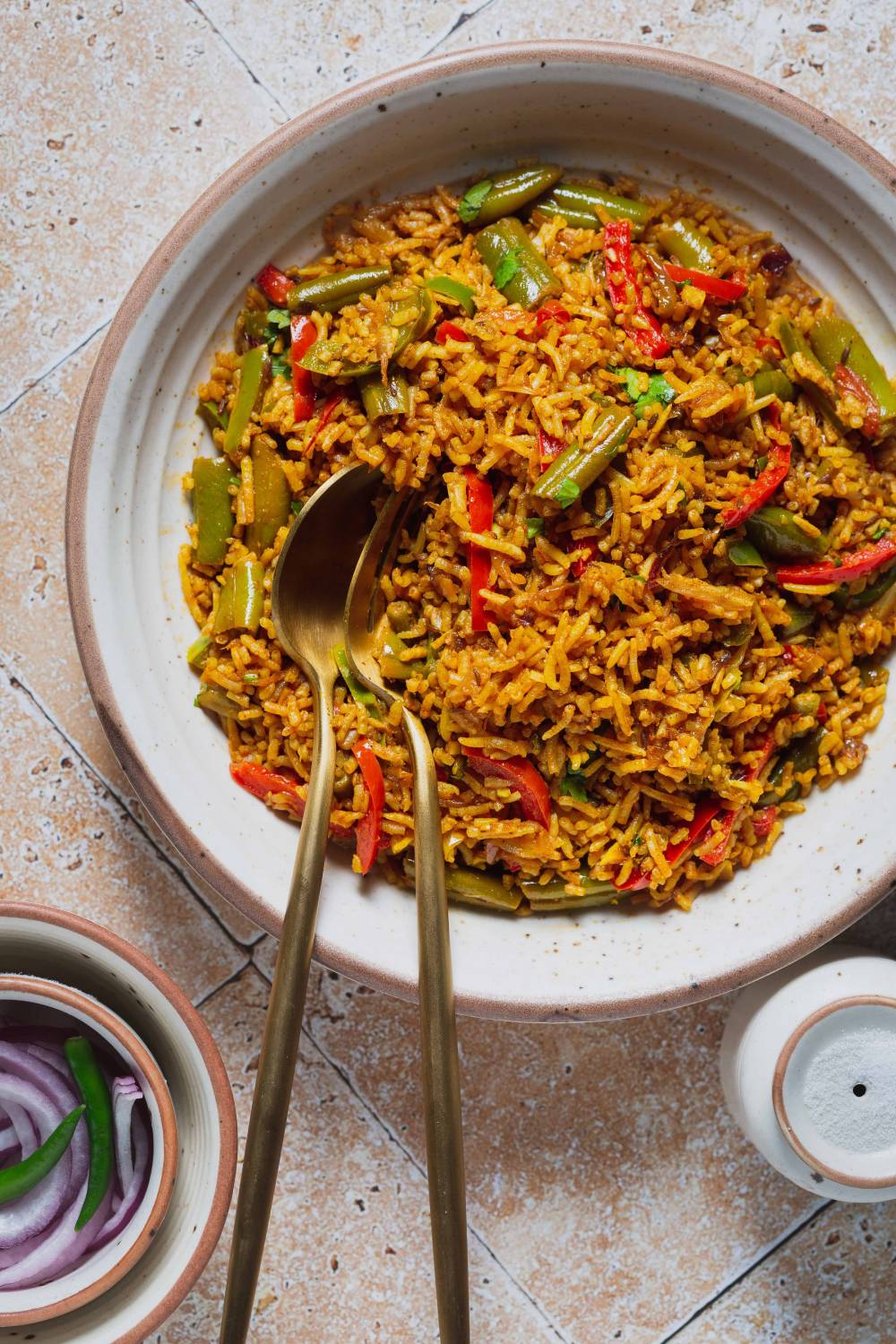 We don’t eat a lot of plain rice in my house but I always make a little bit every week just so we can make some quick fried rice as a last minute lunch option! My husband loves all kinds of fried rice so I changed things up a little bit and made this masala pulav for him, and he loved it! I found myself picking at the green beans in here because of their juiciness and crunchiness, so try not to skip that veggie!