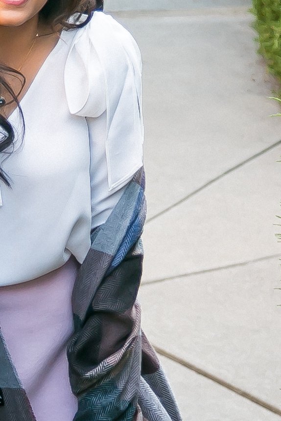 I get tired really quickly of navy, gray, and black (even though I LIVE in these colors from October to March) so I set out to create a fall outfit that had a light and airy look but still felt really cozy and comfy! By pairing a silky white blouse with a textured wool skirt, the outfit goes from summer to fall in an instant! Wear it with suede over the knee boots and a patterned scarf to make the look cohesive- and you’ve got a look that is chic but still super cozy!